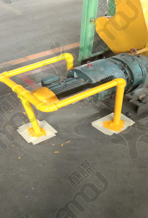 增加電機(jī)防護(hù)支架,用螺栓固定在地面上,方便拆裝。消除安全隱患